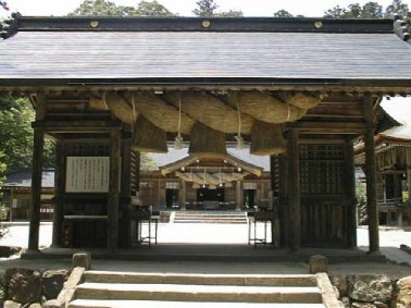 萱葺きの屋根に四方の壁は檜の皮で覆われ、 竹でできた縁がめぐらされています。 鑚火祭の舞台となる場所であり、燧杵・燧臼が 保管されています。 又、出雲國造の「火継式」に使われます。 この建物は大正4年(1915)に鑚火祭が 熊野大社で行われるようになったことから 翌年氏子により建てられました。 他の神社では見ることの出来ない当社特有 の建物であります。 現在の物は平成3年に奉新建されたもの です。 |